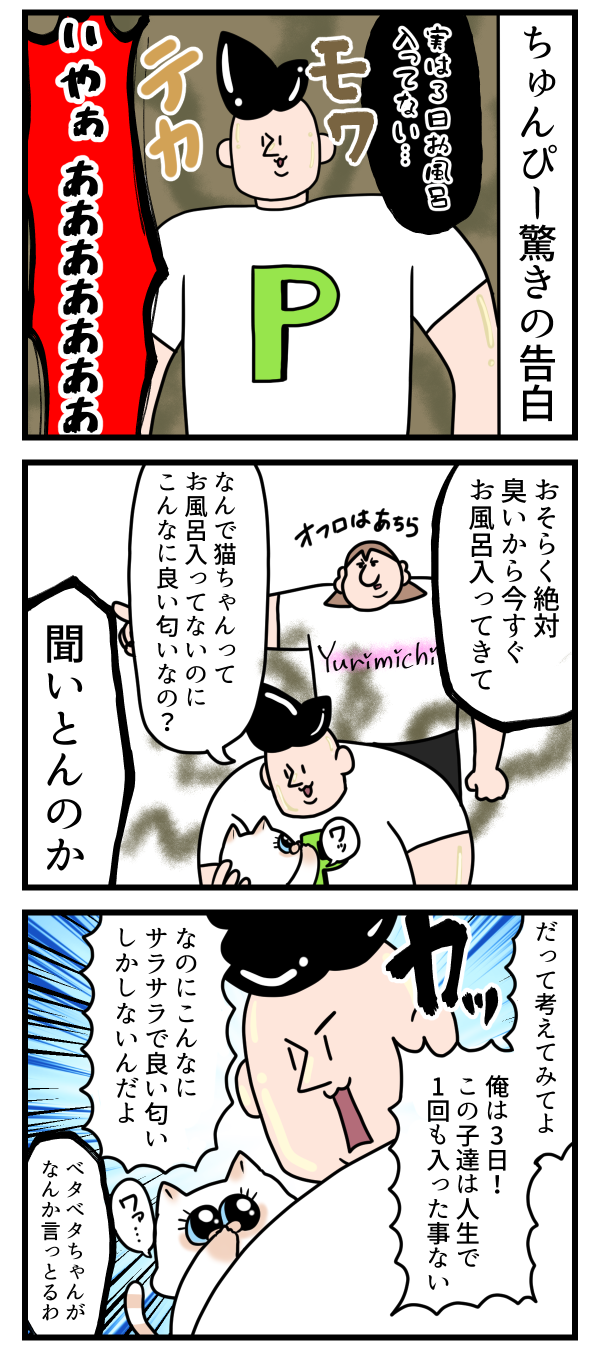 猫ちゃんって良い匂いすぎない? 2024年01月16日 08:30 いつもは毎日お風呂に入るいい子なんです!!!この時だけ悪い子だったんです!!!!にほんブログ村 「ちゅんぴー」カテゴリの最新記事 タグ :#絵日記#日常漫画#日常絵日記#コミックエッセイ#イラスト < 前の記事次の記事 > コメント コメント一覧 (2) 1. くろぴー 2024年01月16日 23:13 清潔感あるタッチの絵だから、ちゅんぴーの汚なさが今ひとつ伝わってこないのが残念!もわんっとにおいたって欲しい! 0 ゆりみち がしました 2. ゆりみち 2024年01月24日 15:12 >>1 3日もお風呂入ってない成人男性の汚さ伝えるのむずーーーい!!!清潔感のあるタッチだなんて…そんな…☺️ 0 ゆりみち がしました コメントフォーム 名前 コメント 記事の評価 リセット リセット 顔 星 情報を記憶 コメントを投稿する