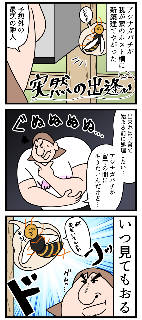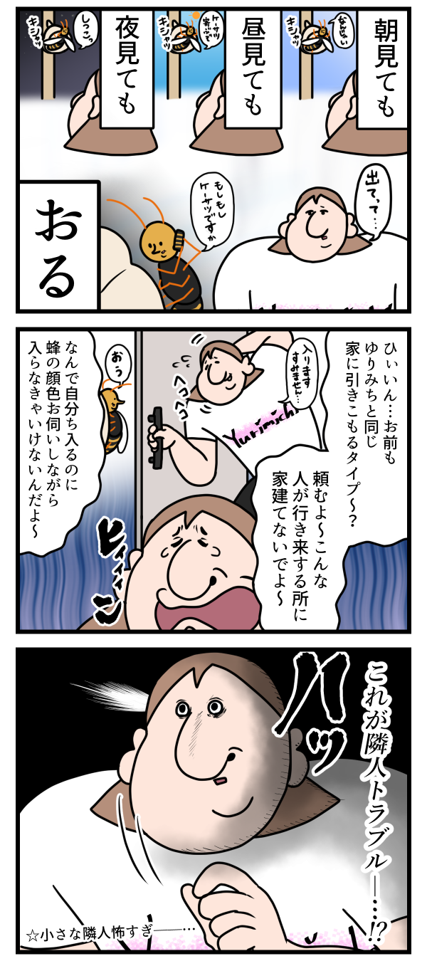 誰だ我が家のポスト横を蜂に紹介したやつ 2024年05月26日 08:30 ブログネタ:【公式】「春だな~」と感じること に参加中! 春は出会いの季節って言うけどこんな隣人望んでないです…………今は強制退去してもらったから大丈夫だよ!👇ゆりみちにぞっこんかい?それならアプリで読者登録だ!👇にほんブログ村 「ゆりみち」カテゴリの最新記事 タグ :#絵日記#日常漫画#日常絵日記#コミックエッセイ#イラスト < 前の記事次の記事 > コメント コメントフォーム 名前 コメント 記事の評価 リセット リセット 顔 星 情報を記憶 コメントを投稿する