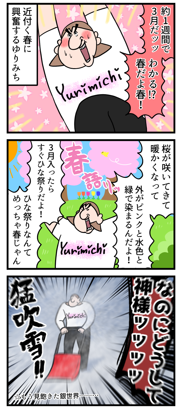 春が待ち遠しい 2025年02月20日 13:10 太陽が出て雪が溶けた時に外を歩くと春の匂い(草と土の匂い)がして興奮するこの頃👇ゆりみちにぞっこんかい?それならアプリで読者登録だ!👇にほんブログ村 「ゆりみち」カテゴリの最新記事 タグ :#絵日記#日常漫画#日常絵日記#コミックエッセイ#イラスト < 前の記事次の記事 > コメント コメントフォーム 名前 コメント 記事の評価 リセット リセット 顔 星 情報を記憶 コメントを投稿する