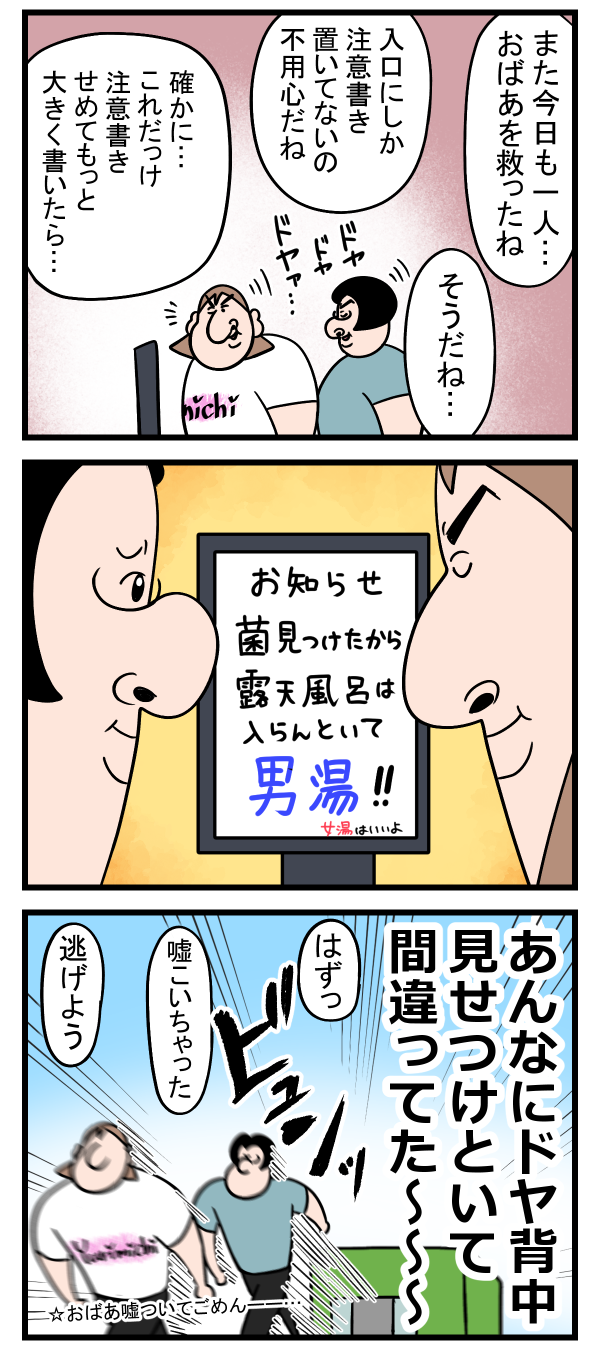 オイラ伝説の早とちりヒーロー 2025年06月06日 12:00 そりゃ露天風呂の入口何も貼ってないわなだって大丈夫だったんだもの~~~~~~~~~事件解決後の相棒の右京さんと亀山並みの背中で温泉出てったのに👇ゆりみちにぞっこんかい?それならアプリで読者登録だ!👇にほんブログ村 「ゆりみち」カテゴリの最新記事 タグ :#絵日記#日常漫画#日常絵日記#コミックエッセイ#イラスト < 前の記事次の記事 > コメント コメントフォーム 名前 コメント 記事の評価 リセット リセット 顔 星 情報を記憶 コメントを投稿する